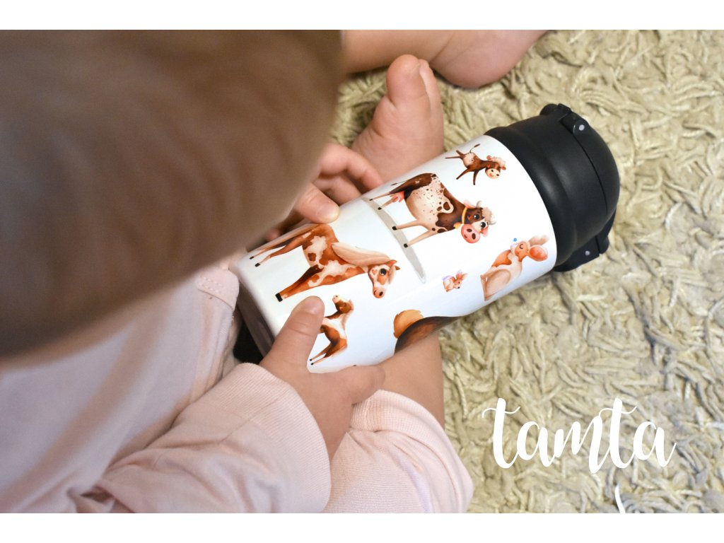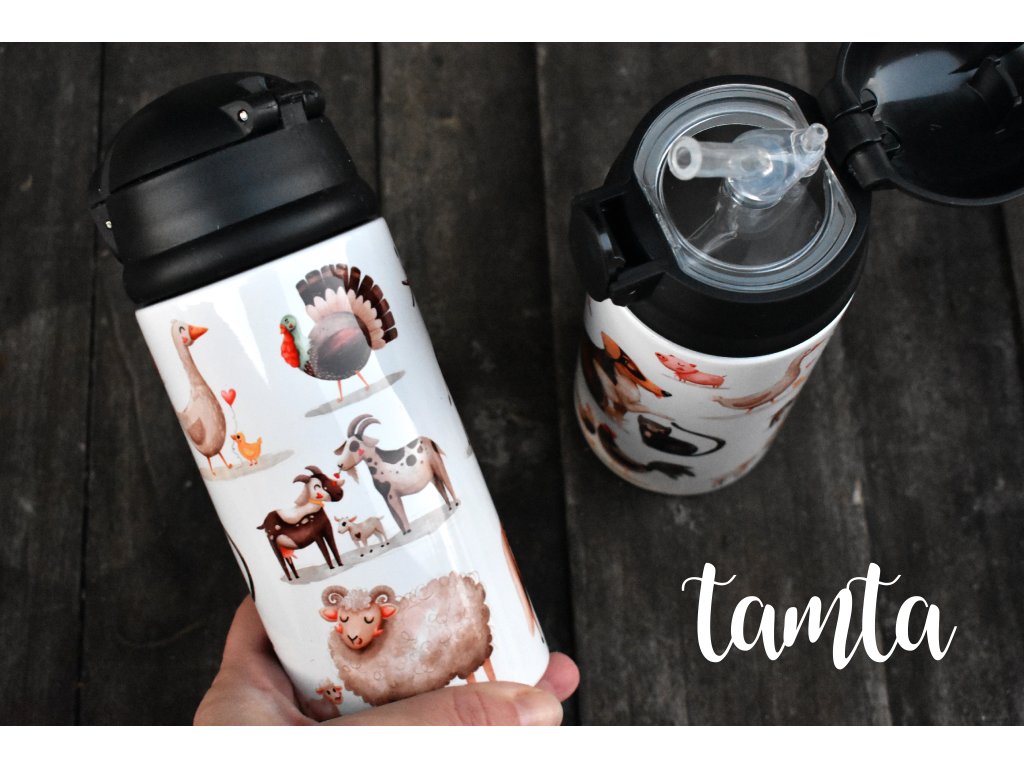 Detská nerezová fľaša s motívom farmárkych zvierat. Ilustrácie sú dielom slovenskej detskej knižnej ilustrátorky Martinky, ktorú na IG môžete nájsť pod @adzusi.art.