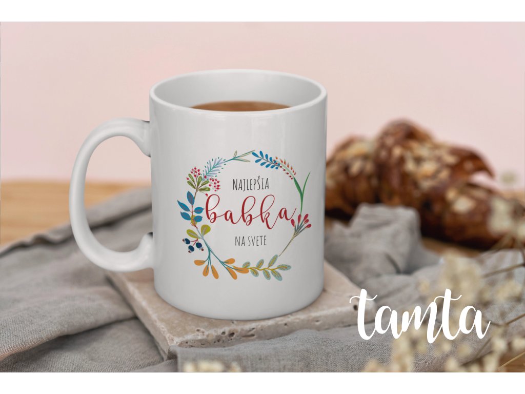 Klasický biely keramický hrnček s objemom 330ml s textom "Najlepšia babka na svete" s jemným kvetinovým vzorom okolo.