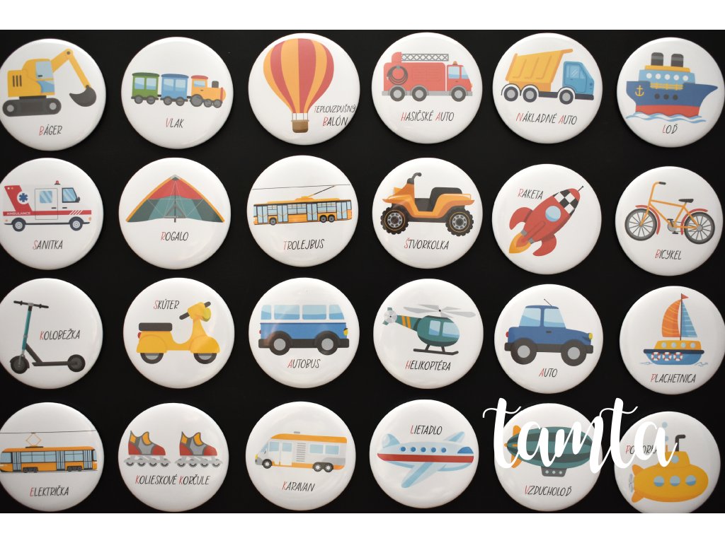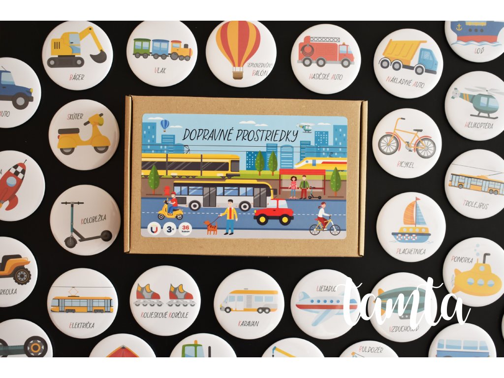 Na magnetkách je zachytených 36 prostriedkov, ktoré sa pohybujú na ceste, vzduchu, vode či na koľajniciach. Magnetky deti môžu pomenúvať, triediť podľa počtu kolies, podľa spôsobu použitia, podľa farby.