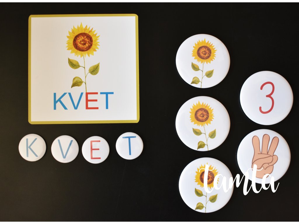 Balenie obsahuje z každého predmetu 10 magnetiek s priemerom 75mm, 1 magnetku v rozmere 148x148 mm, kde je predmet pomenovaný a písmená sú farebné rozdelené na samohlásky (červená farba) a spoluhlásky (modrá farba).
