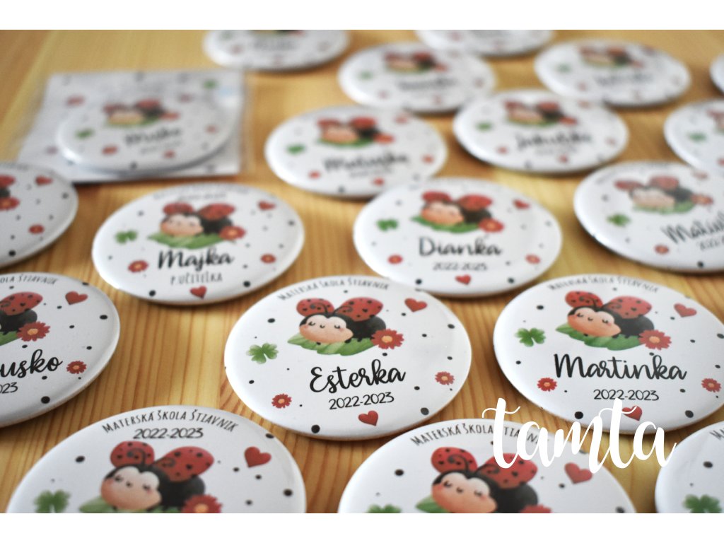 Hľadáte milý a originálny odznak pre škôlku alebo školu? Tento veselý odznak s motívom lienky je ideálny ako spomienka na školský rok, školu v prírode, tábor alebo triednu akciu. Vďaka možnosti doplniť meno dieťaťa, názov triedy či školský rok získate jedinečný personalizovaný odznak na mieru.